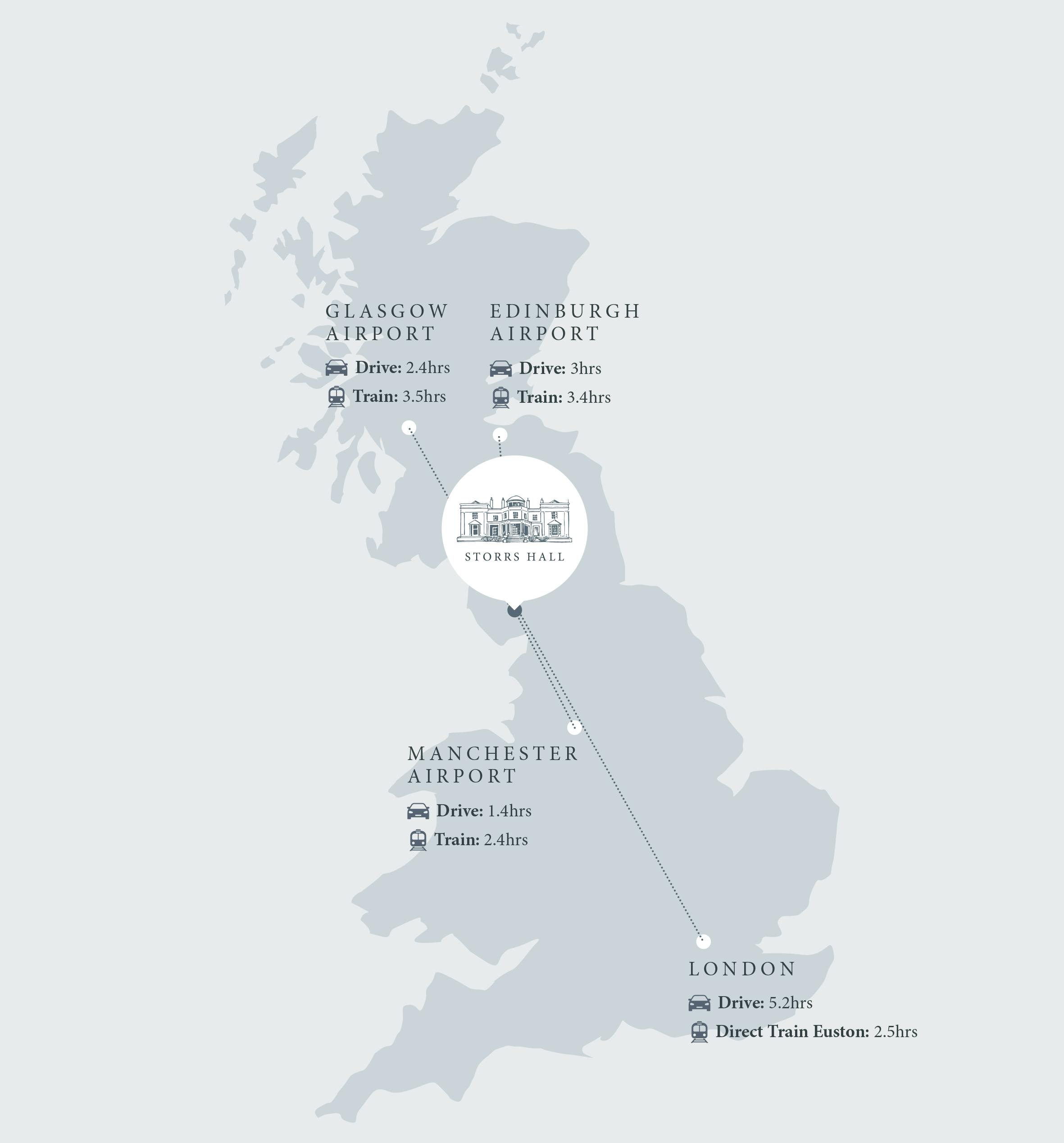 The nearest railway station is Windermere, 5 miles from Storrs Hall. This is serviced by a connecting train from the mainline station of Oxenholme, which is 13 miles from the Hotel. Local taxis are available at both stations.